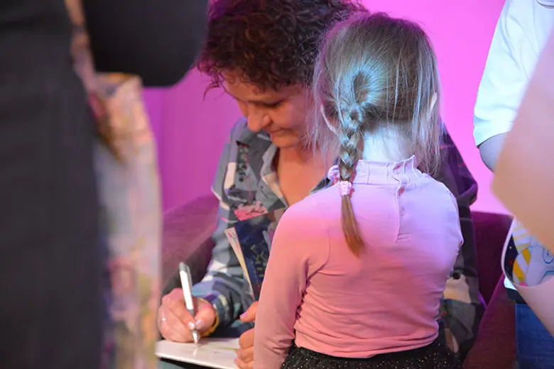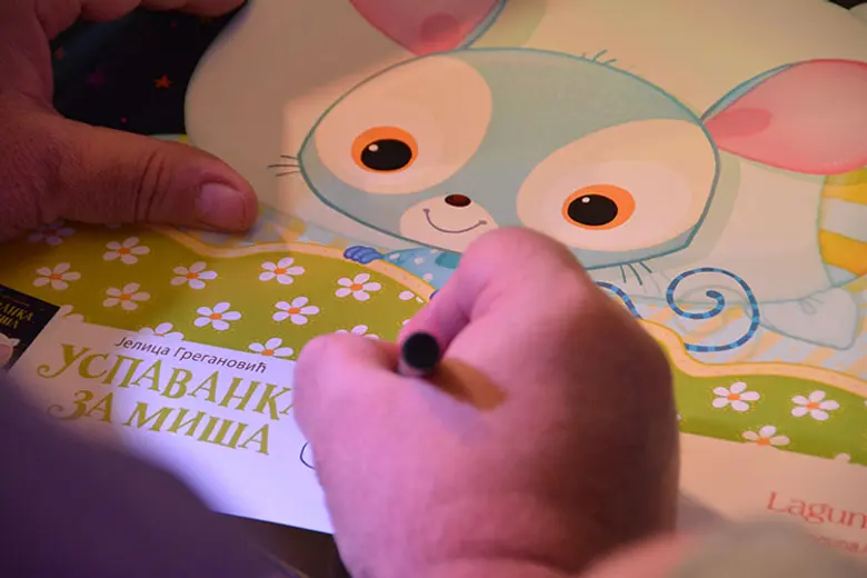 Gorica Nešović je na prepoznatljiv način pročitala celu „Uspavanku za miša“ i izmamila poneki zev najmlađih, dok je Bob na tabli nacrtao glavnog junaka ove knjige i na taj način oduševio prisutne.