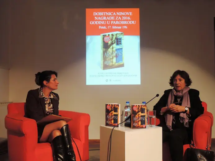 Osim što je publici objasnila šta za nju znači Ninovo priznanje, naziv romana, autorka 63. Ninove nagrade govorila je i o razlozima odabira lika pesnikinje Emili Dikinson u drugom delu „Arzamasa“, kao i o tezi da li pisci i umetnici imaju ikakvu moć, kada se ovde od književnosti teško može živeti.